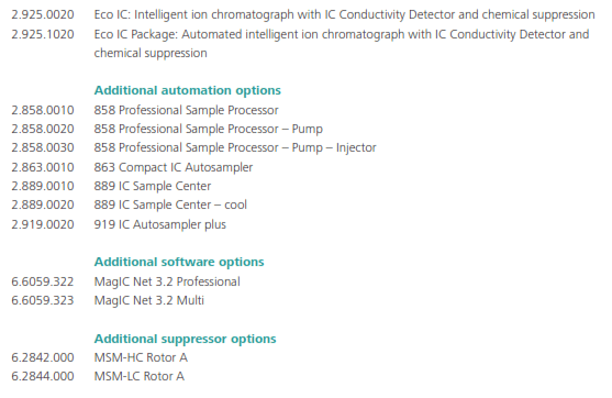 Eco IC bao gồm tất cả các thành phần bạn cần để phân tích thường xuyên anion, cation và các chất phân cực: Bộ khử nhiễu nền, đầu dò độ dẫn và phần mềm - với giá cả phải chăng.